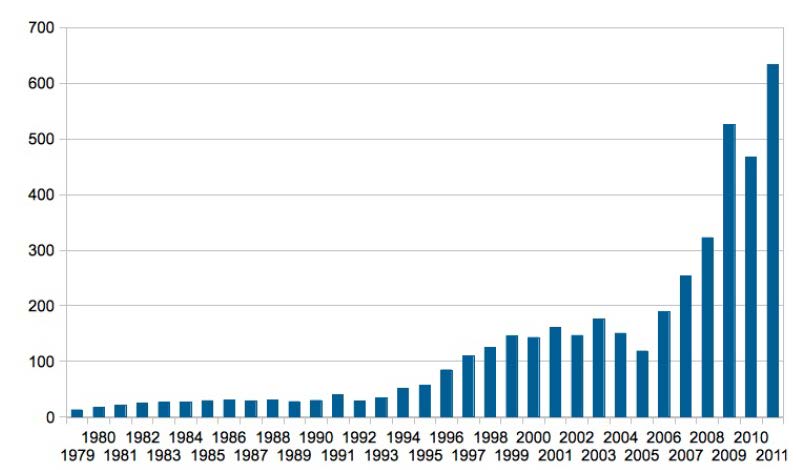 One area in which they are most conceptually different is that ICEWS follows a more traditional approach to event data in seeking to encode a chronology of events that reflects in some sense the putative ground truth of what occurred. The figure on the right shows the corpus of stories in ICEWS (gray) and the resulting events (black): total events are fairly stable over time event though the number of media stories increases. GDELT is more concerned with getting a comprehensive catalogue of all media stories (and other text) on reported events, and the corpus of those media stories is increasing exponentially, as the figure below shows. As a result, the number of events in GDELT is also increasing over time, much more so than ICEWS.